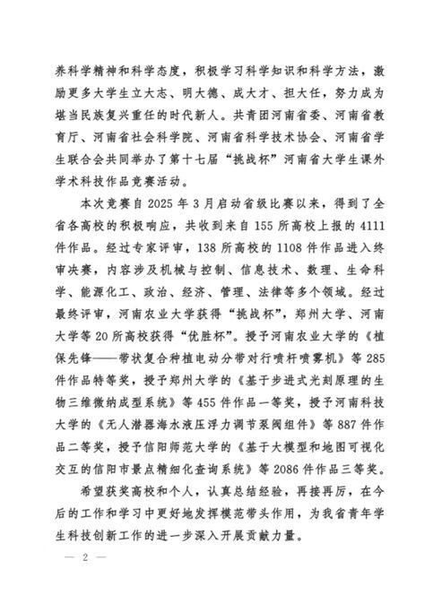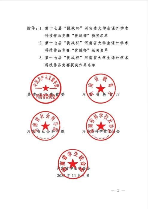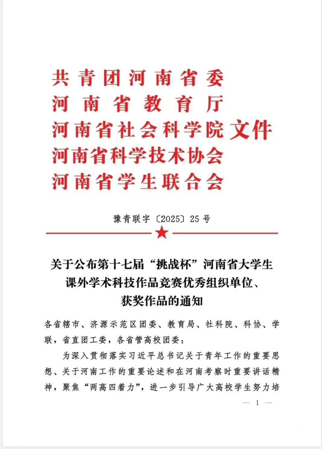 (文/程磊 图/程磊)近日,由共青团河南省委、河南省教育厅、河南省社会科学院、河南省科学技术协会及河南省学生联合会联合主办的第十七届“挑战杯”河南省大学生课外学术科技作品竞赛圆满落幕。机电工程学院学子凭借深厚的学术功底、创新的研究思维以及出色的实践能力,在全省155所高校提交的4111件作品中脱颖而出,取得了令人瞩目的成绩,成功斩获理工科类一等奖2项、理工类二等奖3项、理工类三等奖3项,为学校和学院赢得了极高的荣誉!