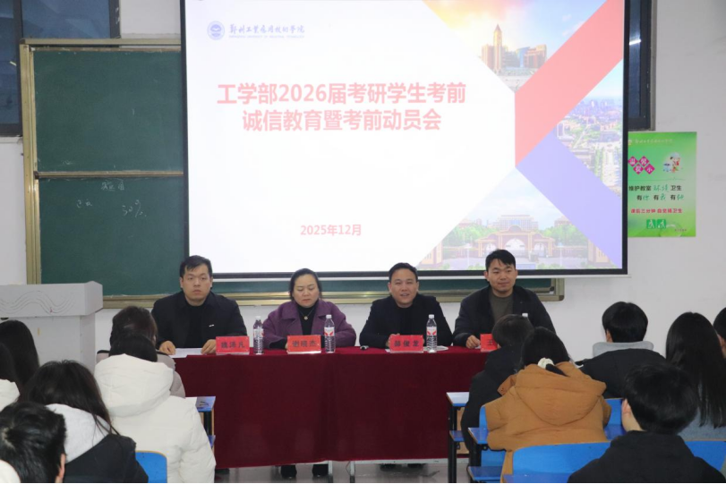 (文/刘鹏帅 图/董新雨)为夯实考研学子诚信应考的基础,提升冲刺阶段的士气,机电工程学院于12月18日18点在建工中楼北一教室召开2026届研究生考试考前诚信教育暨动员会。建筑工程学院院长谢晓杰、机电工程学院党委书记、学管副院长郝俊龙、机电工程学院分团委书记王乐、建筑工程学院分团委书记魏泽凡出席,为全体考研学子答疑解惑、加油鼓劲。