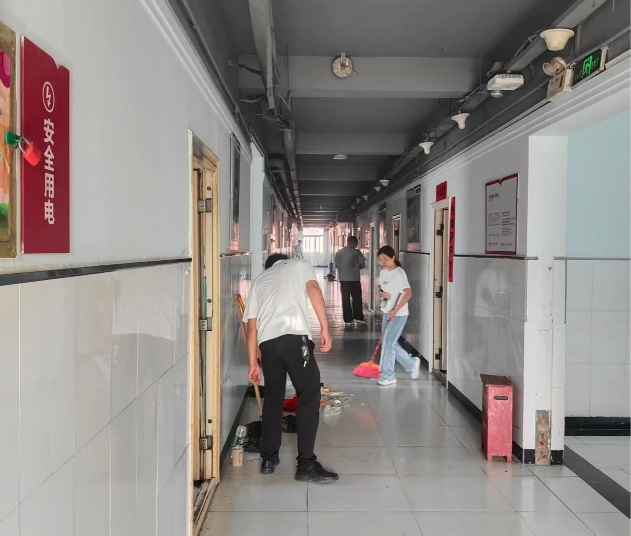 活动中,师生们结合机电专业特色,分工明确,既有协作又有侧重。老师们带领志愿者分成多个小组:一组手持清洁工具,重点清理宿舍衣柜死角、空调滤网及卫生间瓷砖缝隙,用洗涤剂反复擦拭顽固污渍;另一组则由具备基础维修知识的志愿者牵头,借助万用表、扳手等工具,仔细检查宿舍电路、灯具、风扇运行情况,对松动的床板螺丝及时加固,对老化的插线板进行登记并安排更换,确保住宿设施安全无隐患。大家不怕脏、不怕累,原本略显陈旧的宿舍,在师生们的合力打扫下,窗明几净,设施规整。