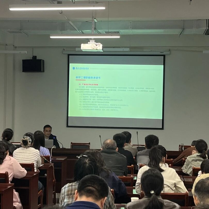 此次会议使机电工程学院全体教职工对师德师风及人事管理制度有了更全面、清晰的认识。会议不仅为教职工履职明确了“红线”与“底线”,更有助于营造风清气正的育人环境,通过规范管理保障教学科研秩序,为学院人才培养质量的提升和长远发展提供坚实的制度保障。