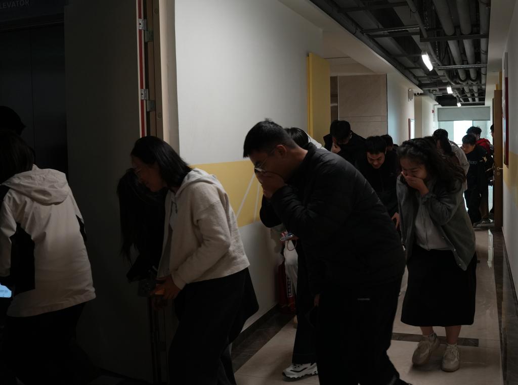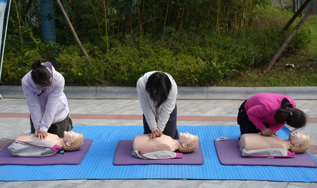 在安全应急演练环节,全体人员在实训中心202室听取消防员讲解演练流程、角色分工与逃生注意事项。模拟火情发生后,任课教师按指导关闭电源、初期控火并报警,工作人员在楼梯口引导,学生弯腰捂鼻沿预设路线有序撤离至1楼大厅。撤离后,任课教师迅速清点人数,发现“呼吸困难”学生,医学院急救人员立即开展心肺复苏模拟操作,并详细讲解操作步骤与要领,还邀请师生上台实操练习。