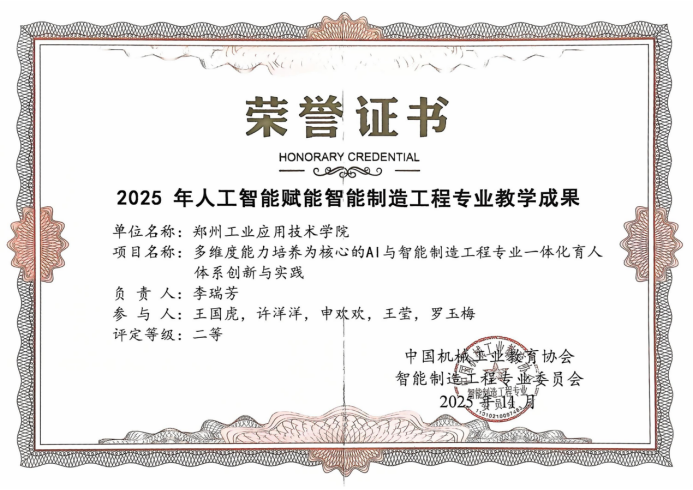 由我院李瑞芳、王国虎、许洋洋、申欢欢、王莹、罗玉梅老师撰写的《多维度能力培养为核心的AI与智能制造工程专业一体化育人体系创新与实践》,被中国机械工业教育协会评定为2025年人工智能赋能智能制造工程专业教学成果二等奖,彰显了我院在专业育人体系创新领域的深厚积淀与突出实力。