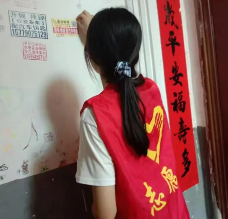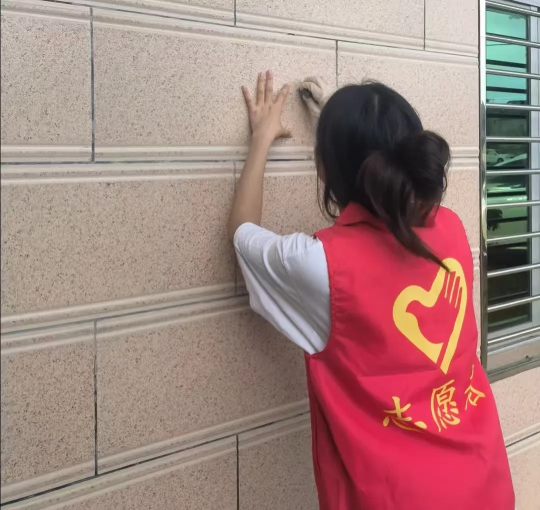 活动当天,周珂媛带齐小铲、喷壶和分类垃圾袋等工具,一抵达社区便立即投入工作。她针对墙面、宣传栏等贴满小广告的“重灾区”,先用水均匀喷湿,待纸张软化后再用铲子仔细清除,并耐心擦去残留胶印。她不顾灰尘沾染,坚持将清理下来的垃圾进行分类投放,始终遵循“不造成二次污染”的原则,使文明清理落到实处。