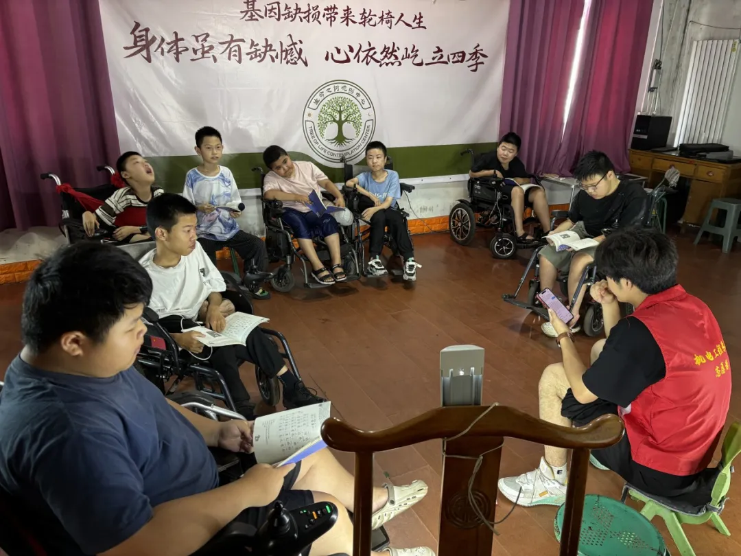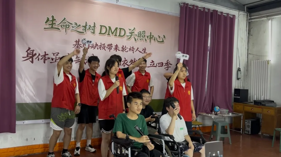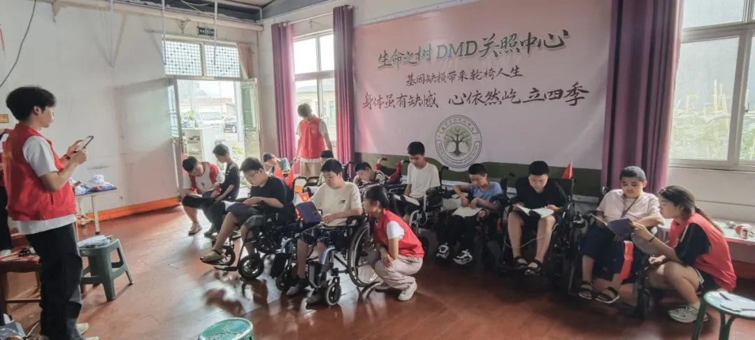 协助患有DMD的孩子起床时,志愿者们的动作轻得像托着易碎的琉璃。DMD引发的肌肉萎缩让孩子们的肢体活动受限,每一个抬手、转身的动作,都需要志愿者们屏住呼吸小心辅助。穿衣服时,他们会先轻轻揉捏孩子僵硬的关节,再顺着肢体的弧度缓缓穿好衣袖;分组陪孩子们刷牙时,志愿者们半蹲在轮椅旁,手把手引导他们握住牙刷,用温水一点点轻柔地清洁口腔。在志愿者眼中,这些孩子从不是“有缺陷的存在”,而是被折断羽翼却仍在奋力振翅的雄鹰,每一次扑腾都闪耀着不屈的光芒。