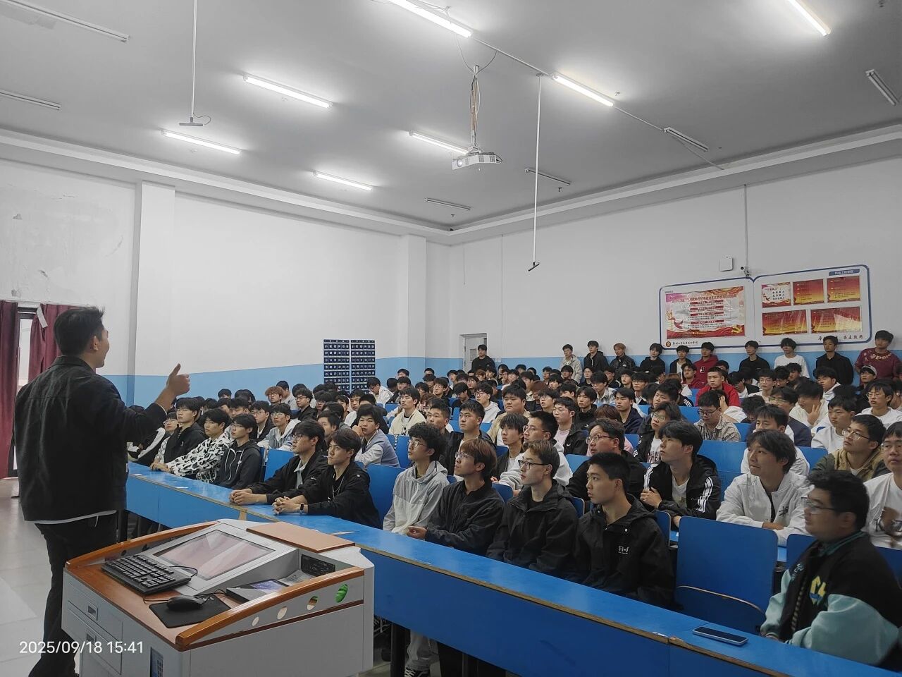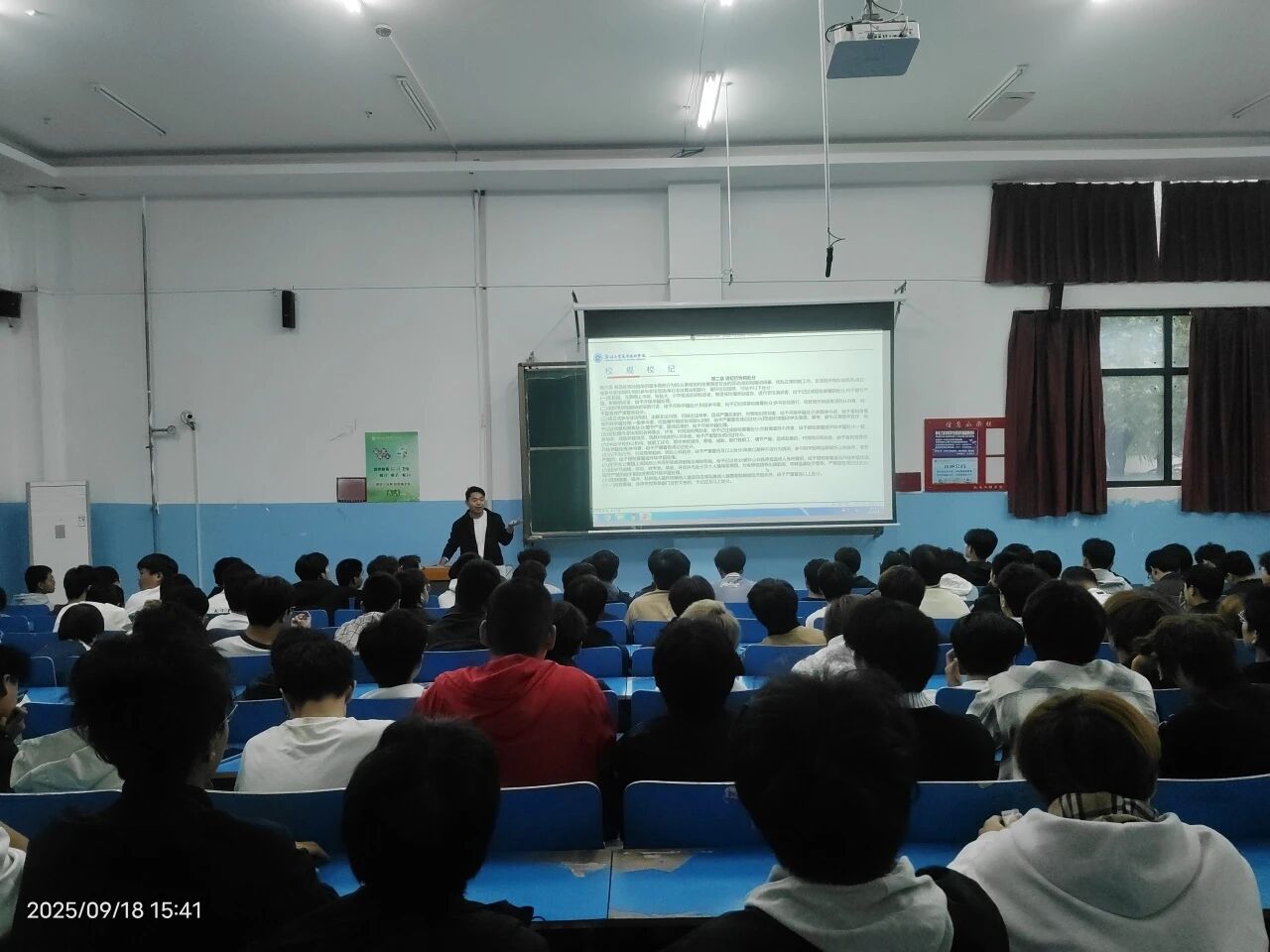 随后,王乐书记结合校园真实案例,对校规校纪进行分模块讲解。从课堂考勤、学术诚信、宿舍安全,到校园活动参与、奖惩评定标准等,他以通俗易懂的语言讲解了各项纪律要求,特别提醒新生警惕学术不端、违规用电等常见问题,引导新生树立“纪律为先、诚信为本”的观念。讲解过程中,王乐书记还与新生实时互动,针对“请假流程”“评优条件”等疑问逐一解答,现场氛围热烈。