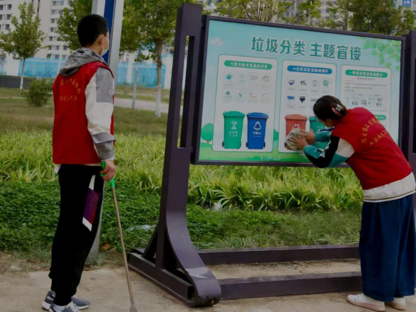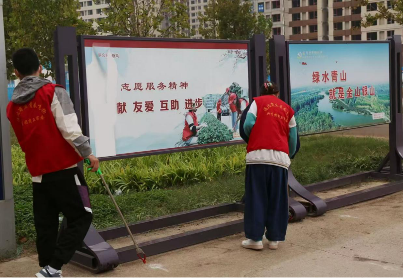 实践中,严梦硕与同学们分工协作,携带垃圾夹、抹布等工具,对社区公共宣传栏、绿化带及道路进行全面清洁。他们仔细清理绿化带中的塑料袋、烟头等杂物,认真擦拭“垃圾分类”“绿水青山就是金山银山”等主题宣传栏,确保宣传内容清晰醒目。同时,他们主动向过往居民讲解垃圾分类知识、志愿服务理念及生态文明重要意义,引导居民自觉践行文明行为。团队成员配合默契,高效完成各项任务,充分展现新时代青年的团队协作精神。