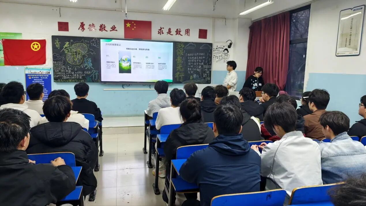 活动在庄严嘹亮的团歌声中正式拉开帷幕。全体团员青年面向团旗肃立,高举右拳重温入团誓词,铿锵有力的誓言掷地有声,充分彰显了新时代青年不忘初心、牢记使命的坚定信念。随后,团支书以“生态文明与青年责任”为主题开展专题宣讲。宣讲紧密结合当前生态环境形势、国家绿色发展政策及身边典型环保案例,深入浅出地普及垃圾分类、低碳生活、节约资源等生态环保知识,引导全体团员青年深刻认识生态文明建设的重要意义,牢固树立 “人人都是环保者、人人争当先行者” 的责任理念。