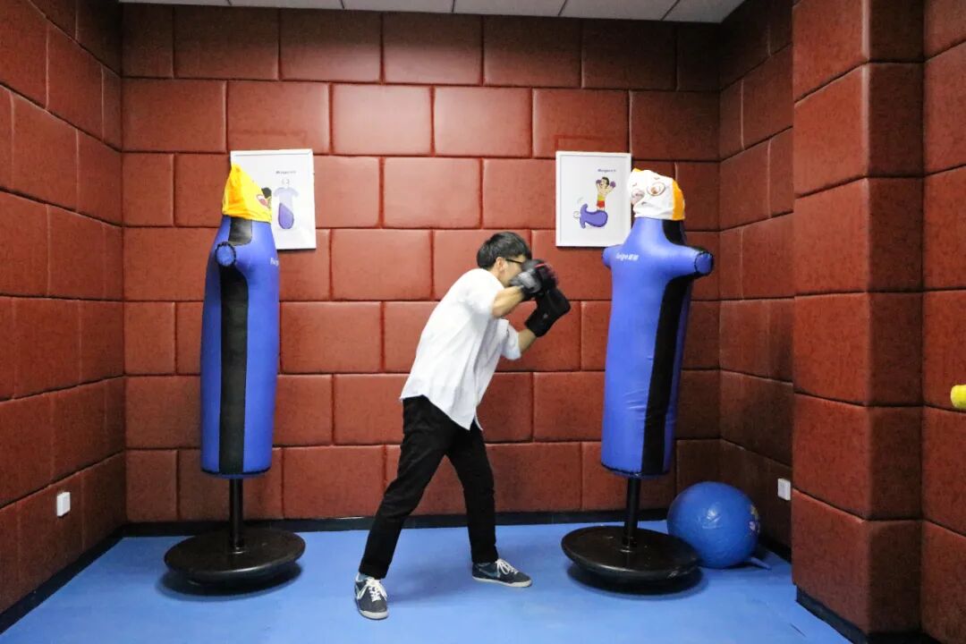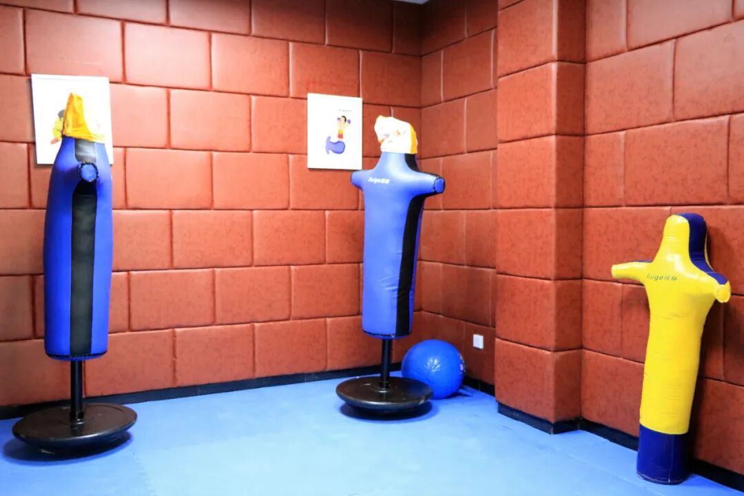 这是一个可以在合理范围内宣泄情绪的场所,配备了宣泄人、宣泄棒、宣泄手套、摔跤人、宣泄球、宣泄脸谱等。在这里,来访者可以通过身体强烈运动的方式,将内心压抑的郁闷、烦躁、愤怒等不愉快的情绪情感进行宣泄,达到心理调适的目的,进一步为自身心理疏导创造良好氛围。