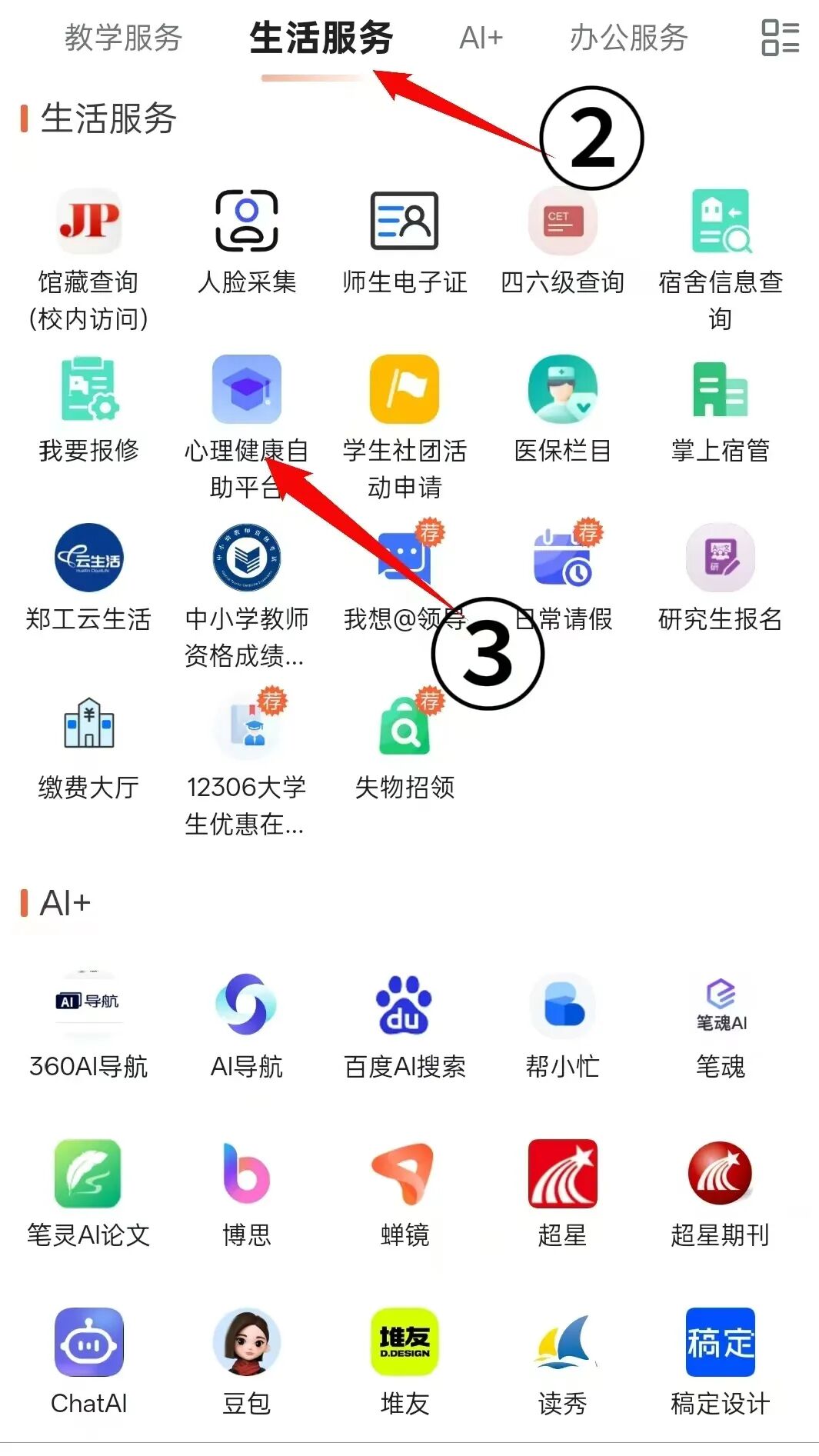 进入平台流程:打开数字郑工APP—更多—生活服务—心理健康自助平台。