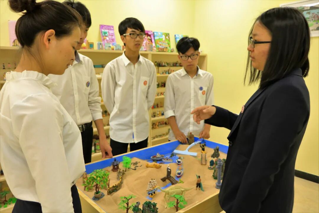 沙盘室共有1800件标准沙具,个体沙盘和团体沙盘各1个。沙盘游戏又称箱庭疗法,是指学生在心理咨询师的陪伴下,从沙具架上自由挑选沙具,在盛有细沙的特制箱子中进行自我表现的一种心理治疗的方法。